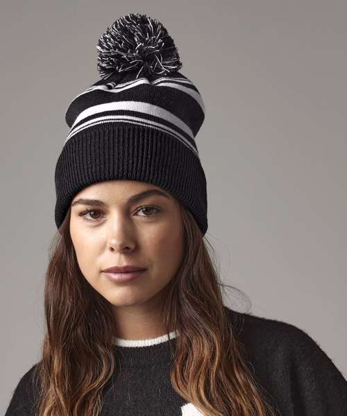 Bring this hat to life with the logo and colours of any team. The Striped fan beanie comes in a variety of colour combinations, topped with a matching decorative pom pom. It has an engineered crown for a snug fit and a ribbed cuff that can be adjusted for ultimate comfort. Style with a scarf and gloves for those chilly stadium days.