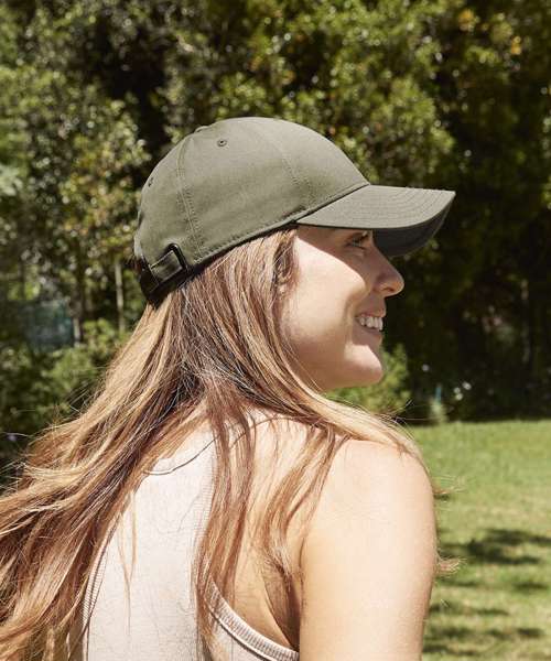 Contains 100% certified, organically grown cotton. 6-panel design. Structured front panels. Stitched ventilation eyelets. Self-fabric strap with gunmetal buckle. TearAway label for ease of rebranding.