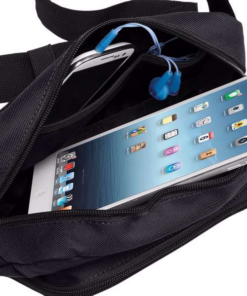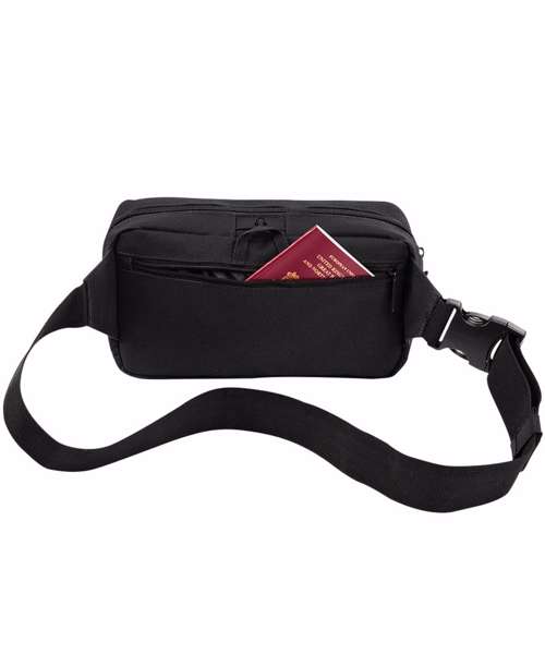 Adjustable webbing belt with secure clip fastener. Headphone port. Zippered rear pocket. Large zippered main pocket. Internal mesh pocket. Key hook.