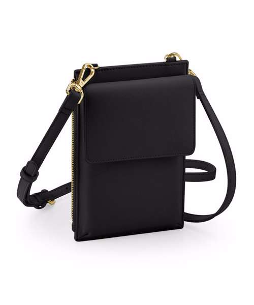 PU backing and lining. Saffiano fine grain. Soft-touch lining. Zipped valuables pocket. Front flap with magnetic closure. Detachable and adjustable cross-body strap. High-shine gold metal zip. Tear-away label for ease of rebranding.