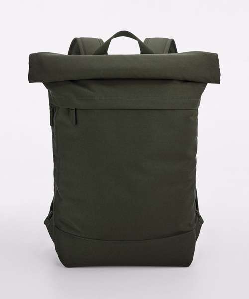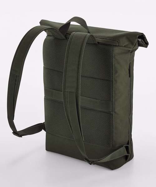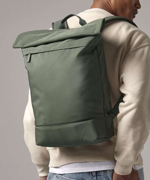 Contains 100% certified recycled polyester. Water-repellent fabric. Minimalist styling. Magnetic roll-top closure. Padded laptop compartment, compatible up to 15.6". External pocket for easy access to internal laptop compartment. Zipped side pocket for bottle/umbrella. Exterior zipped front pocket for easy decoration. Internal slip pocket. Padded air mesh back panel. PU, self-coloured zip pulls. Rear luggage strap. Padded, adjustable mesh shoulder straps. TearAway label for ease of rebranding.