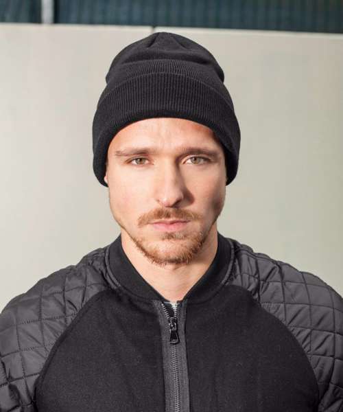 The cool Heavy knit beanie is a truly versatile item that can be combined with a variety of looks. The lightly elasticated closely knit fabric fits snugly on your head. The wide, folded over band is ideal for flocking or embroidery.