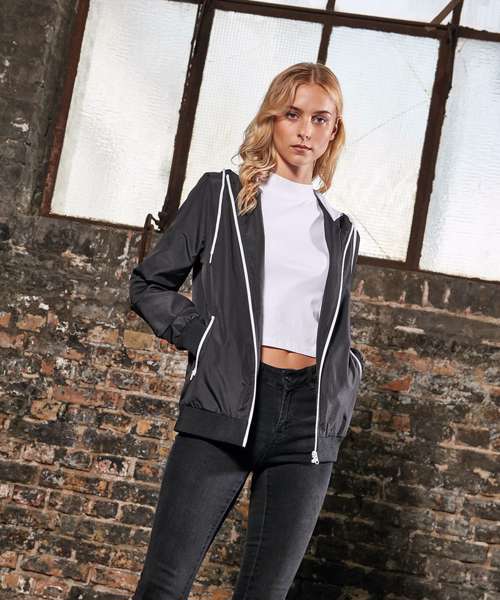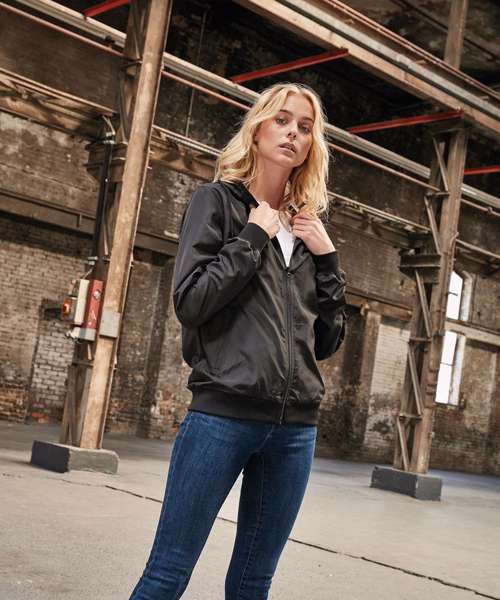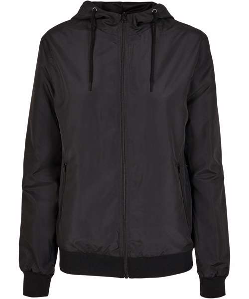 Casual basic windbreaker for women made of 37% recycled mesh material with ribbed cuffs and hem. Perfect for printing the jacket - insert in the back and the lining hem with zipper ensure that the jacket can be printed without problems. Top wearing comfort thanks to the pleasant material, the light mesh lining and the regular cut plus hood with drawstring.