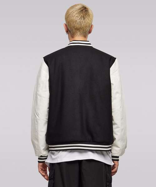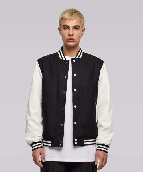 Equipped with contrasting sleeves, this men’s college jacket exudes retro vibes. Classic details such as a snap button placket, striped stand-up collar, hem and cuffs complete the look. Its design is rounded off by colour-accentuated side pockets and rib cuffs. The fabric consist of wool and viscose to ensure comfort in this regular cut. The jacket can further be refined via embroidery.