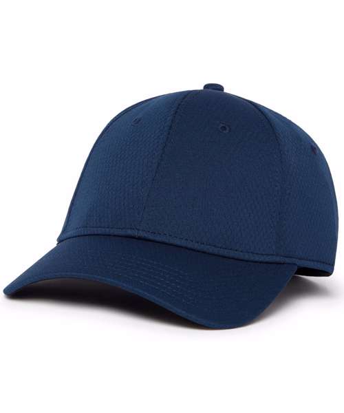 Men's front crested cap. 100% polyester in hex fabric design. Performance fabric. 30+ UV protection. Small chev rubber tab on an adjustable back fastening. Moisture-wicking sweatband.