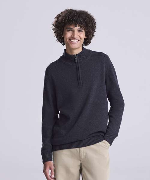 Long sleeve sweater made from regenerated cotton with tall collar and ¼ zip neck. Contrast rib stitches at shoulders cuff and hem.