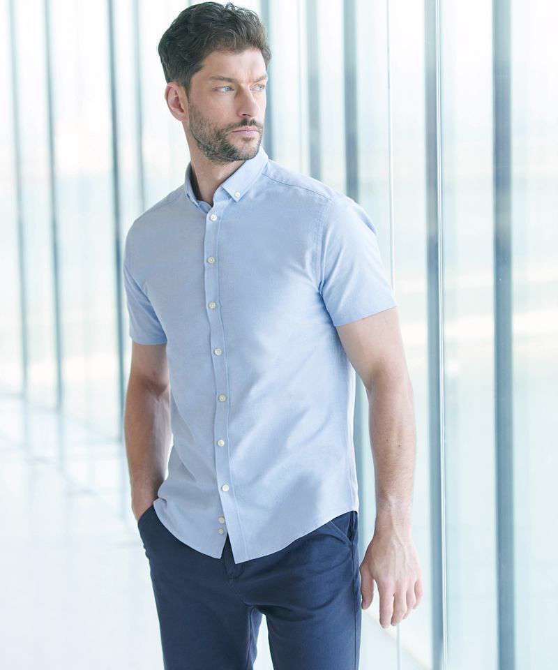 Modern fit, button-down Oxford shirt available in Regular and Slim fit. Cotton-rich lightweight Oxford with wrinkle resistant finish. Short point collar. Pearlised buttons.