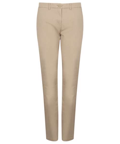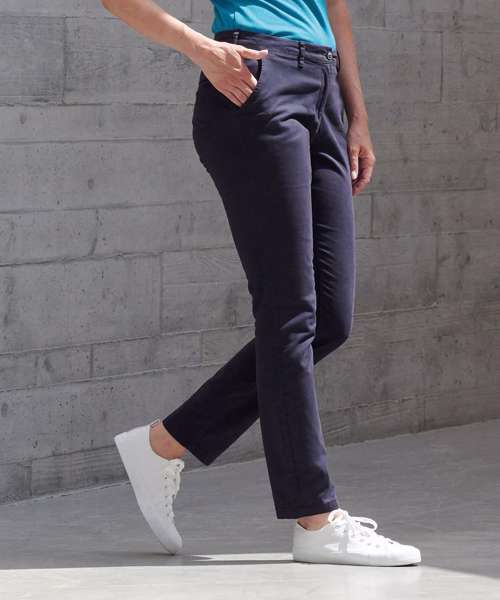 Women's slim fitting chino with added stretch for comfort and ease of movement. Includes YKK front zipper, belt loops, slanted side pockets, two single jet back pockets, back darts for added fit and DTM buttons.
