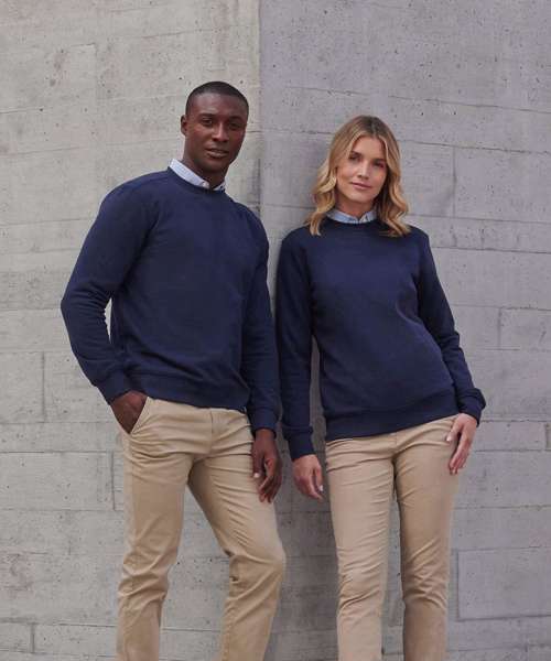 Fabric using recycled materials. Regenerated cotton mixed with recycled polyester. Brush back fleece. Set-in sleeves. Ribbed cuffs and hemline. V insert at neckline. Back neck tape. Regular fit. Henbury cut-out label for easy rebranding.