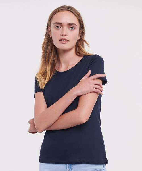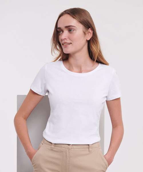 Contemporary shaped fit. Custom developed shoulder to shoulder tape offering greater stability and elegant look. Small size label in the left side of the neck and removable adhesive label. Narrow collar band with lycra. Side-seams improve fit. Comfortable, cool and light texture. Smooth surface for best print results. Contains organic cotton.