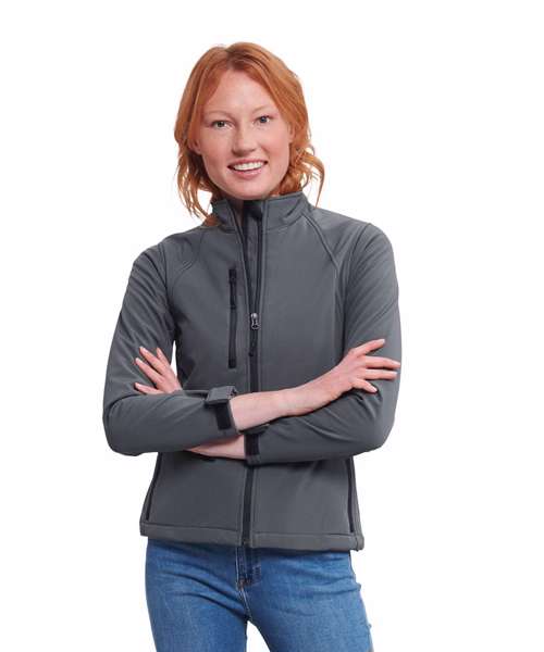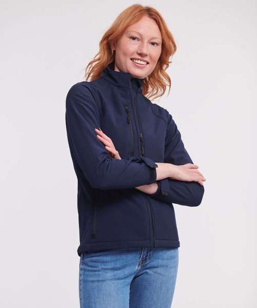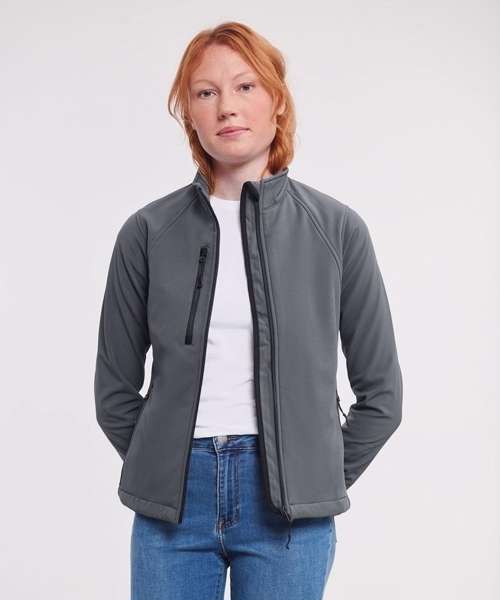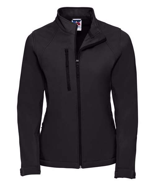3 layer softshell fabric with breathable membrane and bonded microfleece lining, water resistant to 5000mm. Side pockets and chest pocket with inner lining, reversed zip and cord pulls. Full zip with inner storm flap and zip neck protector at collar. Bungee cord in hem. Adjustable cuffs. Drop tail. Feminine fit. Large left chest side decoration access. Fully launderable at 40°C.