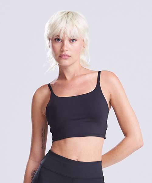 The women’s recycled tech sports bra has four-way stretch for maximum comfort whilst not restricting movement. Incorporates sleek, fashion-forward design. The cups are removable and the straps adjustable, so it can reshape to your needs.