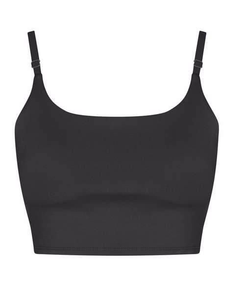 Four-way stretch for maximum movement. Removable padded bust cups. Adjustable straps. Internal support. Made with recycled polyester.