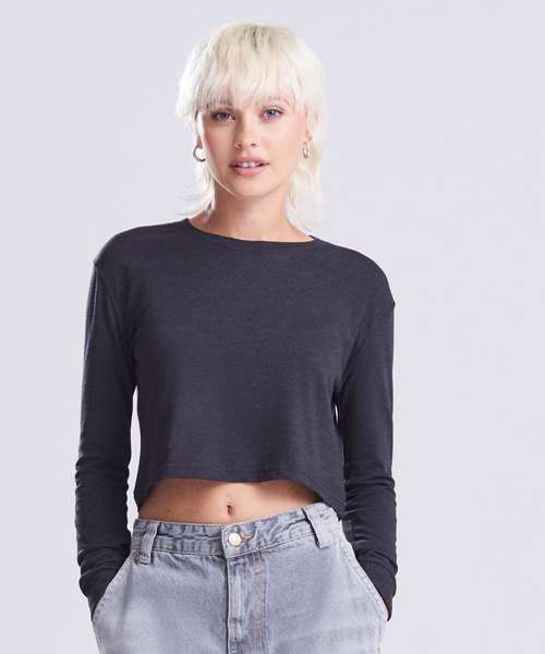 Cropped women’s fit with side seams. Long sleeves with cuffs. Size label only, for easy rebranding – colour-coded white for women. Triblend fabric for style and comfort. Surface excellent for print or embroidery. Ribbed crew neck style, with taped neck. Twin-needle stitching detail on sleeve and bottom hem.