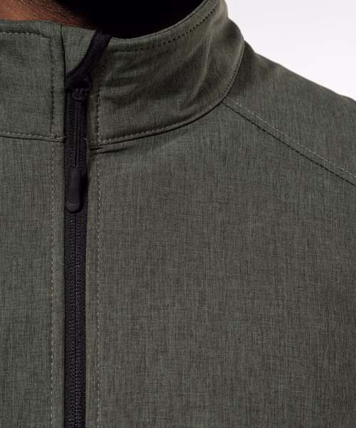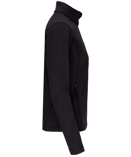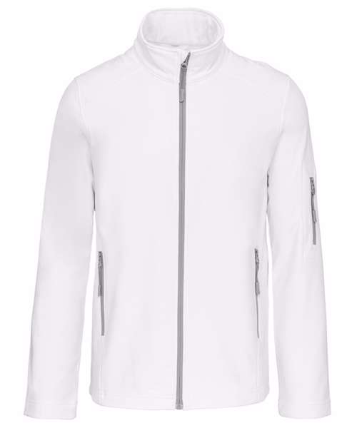 95% polyester/5% elastane. Softshell triple-layer bonded fabric. 3000 gsm/24h breathable and 8000 mm water-resistant. Breathable mid layer and micro fleece thermal inner layer. Zip through front. 2 zipped side pockets. 1 zipped left sleeve pocket.