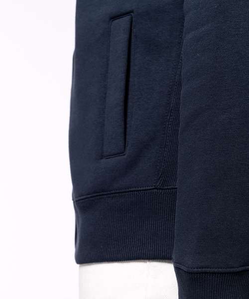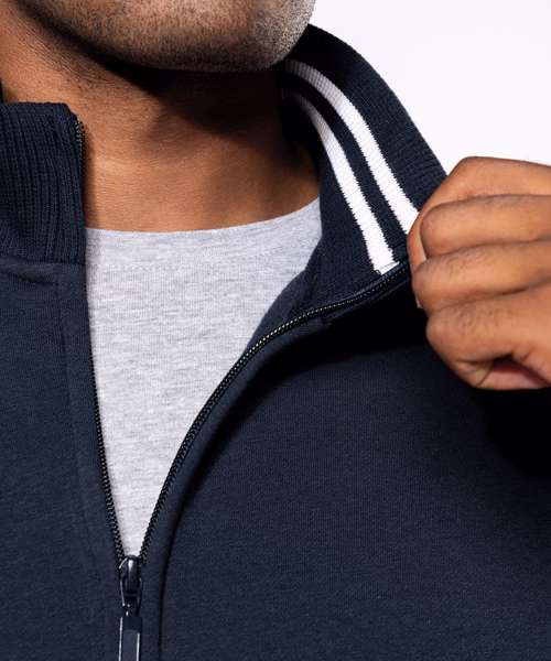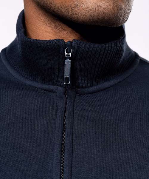 80% combed cotton/20% polyester. Low shrinkage brushed fleece. Silicone wash. Fitted style with ribbed side panels. Matching neck tape (except for White body where neck tape is Oxford Grey). Contrast striped ribbed inner collar (White for all colours, except for White body where stripes are Oxford Grey). 2 front pockets. Ribbed cuffs and hem. Zip fastening. Certified STANDARD 100 by OEKO-TEX® N° CQ 1007/8, IFTH.
