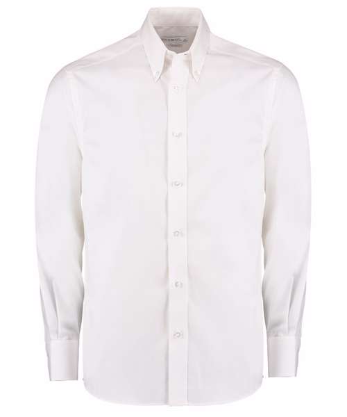 Fused stand-up button-down collar. Rounded hem. Back yoke. Two button cuff with one button pointed cuff placket. Single-stitched cuffs. Single-stitched yoke and armhole seams. Double-stitched side and sleeve seams. Spare buttons. Kustom Kit® woven back neck label.