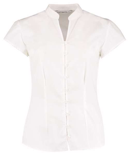 Stand-up mandarin collar. Front inner modesty placket. Self fabric button loops. Two front darts. Two bust darts. Two back darts, Kustom Kit® woven back neck label.