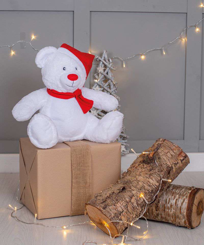 This Christmas bear will brighten up everyone's Christmas with its knitted hat and scarf in red. The front panel can be decorated with embroidery, vinyl or sublimation printing.