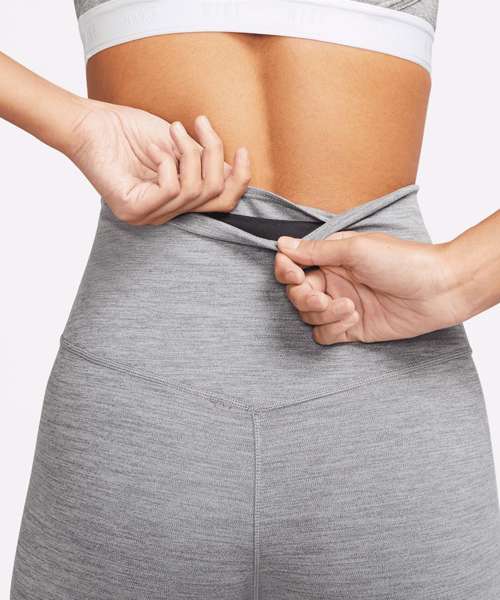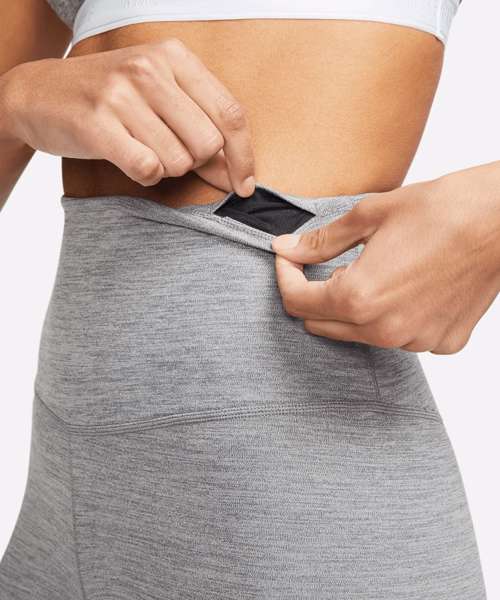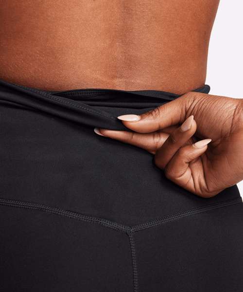 Non-sheer fabric passes the squat test to keep you covered. The sides are seamless and the waistband is contoured with a V shape on the back to give you a smooth silhouette. Stretchy fabric with Dri-FIT technology moves sweat from your skin for quicker evaporation to help you stay dry and comfortable. The design includes a hidden pocket in the high-rise waistband to keep you ready for whatever you tackle in a day. Tight fit for a body-hugging feel.