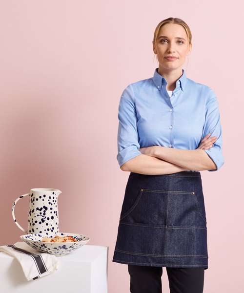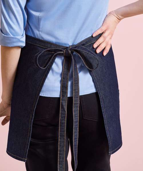 We have combined practicality with style and are proud to present this trendy denim waist apron that is a welcome addition to the hospitality wear collection. A popular cropped style featuring contrast stitch detail that forms four front pockets which are handy for carrying payment terminals and order pads. Self-fabric ties are long enough to be doubled and tied at the front completing a neat and professional uniform for service staff.