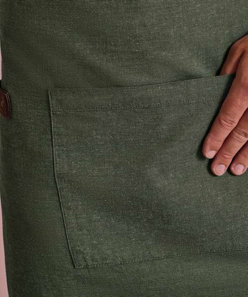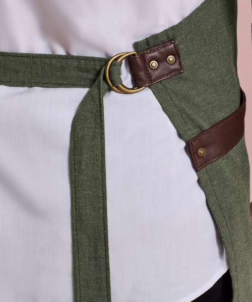 An attractive bib apron using yarn-dyed cotton threads that are woven together to create a pleasing contrast effect. To the centre lies a tablet-friendly pocket with combined pen pocket. A self-fabric tie can be looped through and secured in place using a double D-ring at the waist. Faux leather fabric features for decoration and practicality finish off this stunning apron.