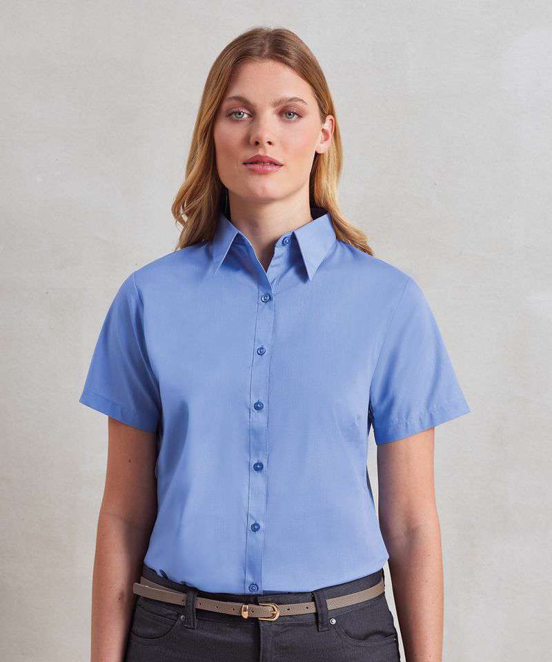 A ladies short sleeved Poplin blouse with semi fitted styling, available in 30 colours. The blouse features soft collar styling with bust and back darts and a rounded bottom hem for an attractive piece of workwear for women.