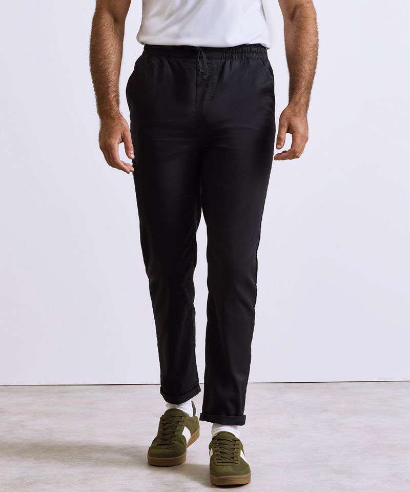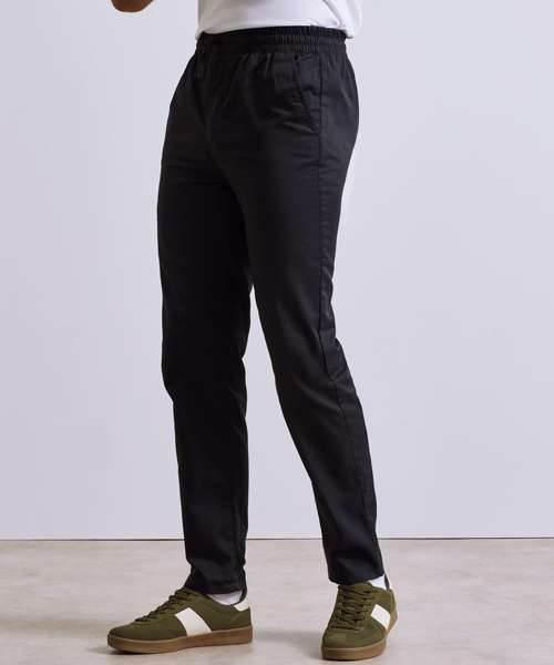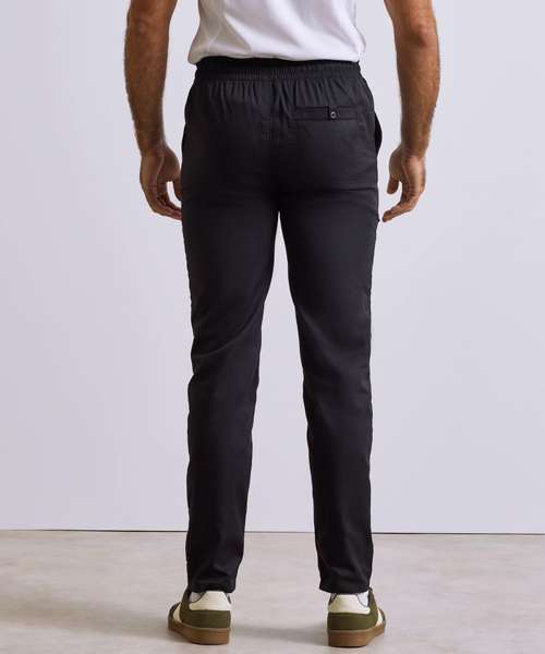 Lightweight chef’s cargo trousers made with certified recycled polyester. Elasticated waistband and drawcord. Mock stitched fly. Two side swing pockets. Welt pocket to the upper right leg with combined pen pocket. Single welt pocket to the reverse with press stud tab for fastening. A tapered fit to the lower leg with optional turn-up hem for styling.