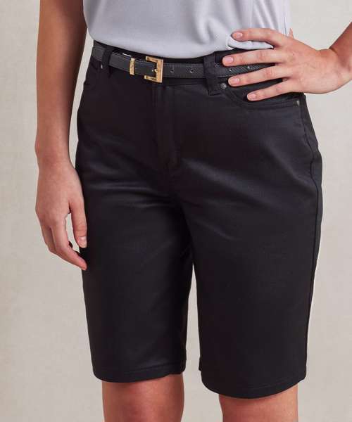 Based on the popular chino jeans, these women’s chino shorts are styled with a covered zip fly fastening and button to the waistband. There are loops on the waistband to facilitate a belt, two side pockets with rivet detail and two patch pockets to the reverse. Finished with a double turned hem, they are a great option for the warmer months and offer a more casual and playful approach to corporate dressing. A touch of elastane through the fabric provides an element of stretch for maximum comfort.