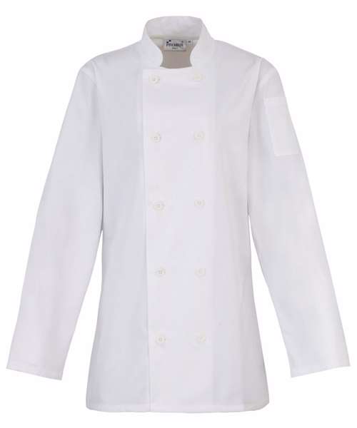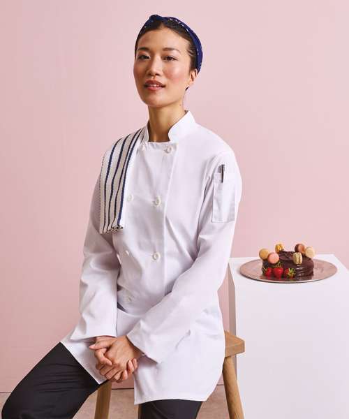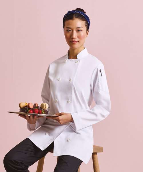 A chef's jacket designed for women with a fitted styling around the upper arm, waist and bust areas. The left arm has a useful pen pocket. Fastened with white buttons in a wrap over style, this jacket is a welcome addition to the Premier range.