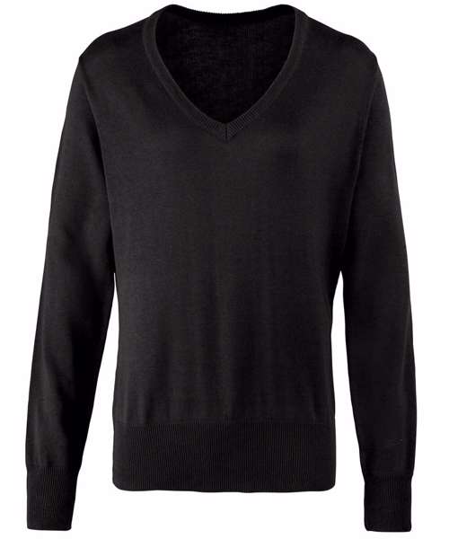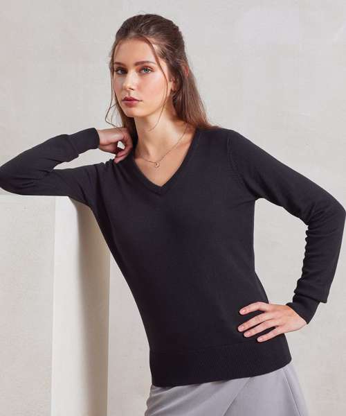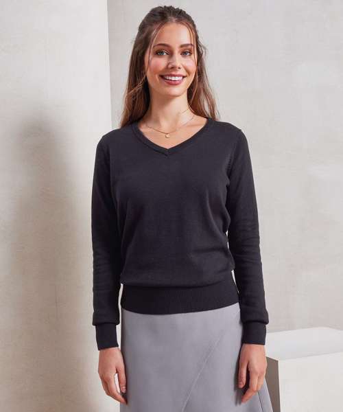 A ladies V neck jumper made from a fine gauge knitted cotton rich yarn. The V-neck styling means this ladies sweater can be worn over a blouse with a scarf on the neckline. The sleeves and hem are set in making for a really contemporary piece that is perfect for professional office environments.