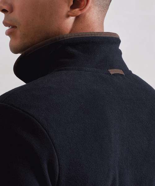 Men’s long sleeve fleece jacket with contrast trim detail. High neck rounded collar, leading into a two-way zipper. Two zipped external pockets and two internal open pockets. Stitched side panel detail. Elasticated cuff with trim detail. Contrast fabric hook on back of collar for hanging up.