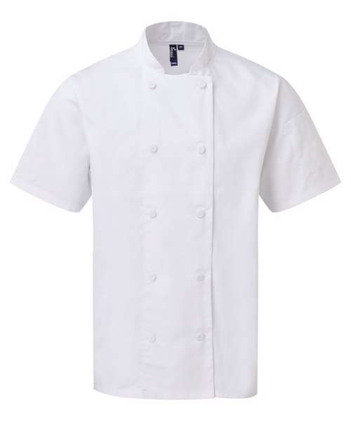 A short sleeve chef's jacket constructed with our very own Coolchecker® fabric. The centre back panel is made from the Coolchecker® fabric which offers exceptional moisture management and wicking properties so chef stays fresh and cool during service. A wrap over fastening with ten self-fabric buttons with a mandarin collar and a useful double pen pocket on the left arm.