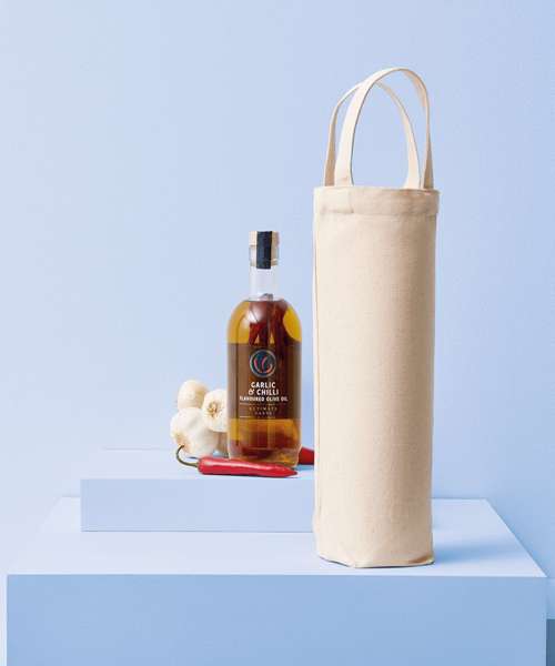 Premium bottle bag. 100% recycled cotton canvas. 220gsm. Short handles. Handle measurements: 2 x 22.5cm. One size. Holds bottles of up to 1.5 litres in capacity.