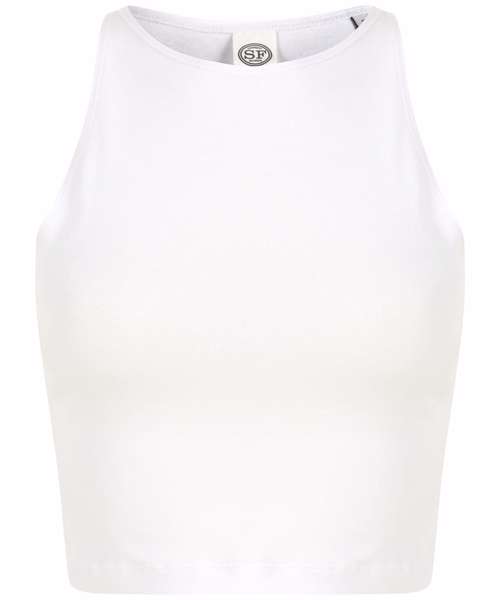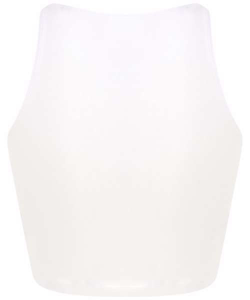 Sleeveless cropped top, with a fitted neckline that's ultra flattering on the shoulders. High fashion. High impact. Tear-out label for easy re-branding.