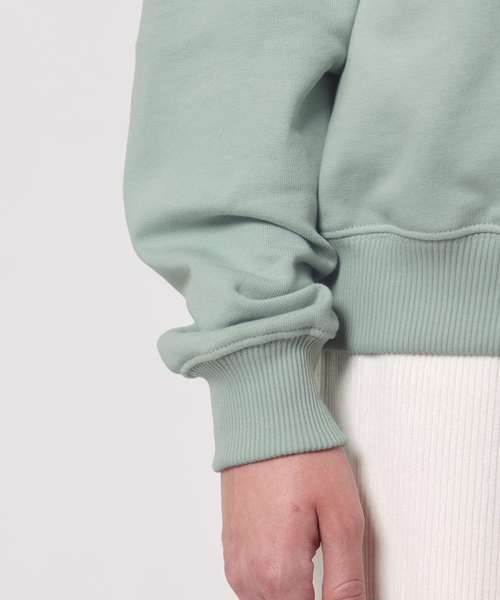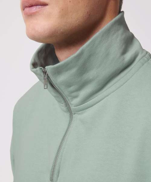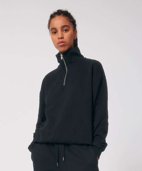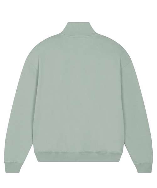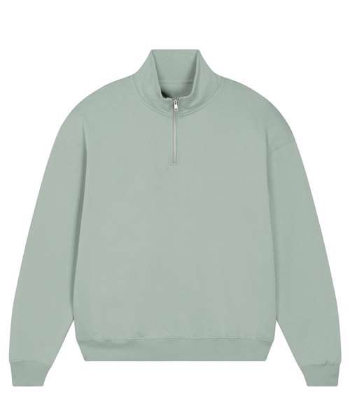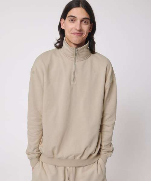 Unisex boxy dry hand feel quarter zip sweatshirt. Set-in sleeve. Neck collar in self-fabric. Herringbone tape at inside back neck and at inside of zip. Quarter zip at centre front. 2x1 rib at sleeve hem and bottom hem. Armhole, sleeve hem and bottom hem with twin-needle topstitch.