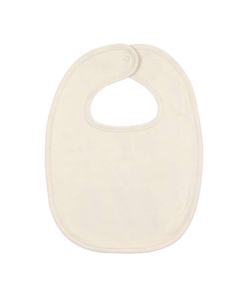 Baby bib. Double-layer interlock. Self-fabric rouleau binding at neck and outside edge. Double snap-closure size adjustment at back neck.