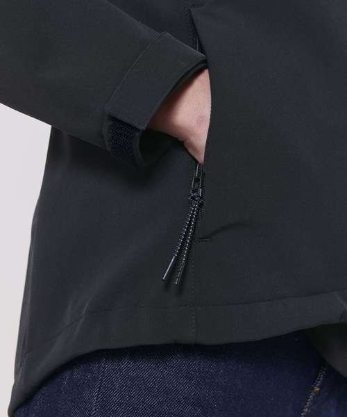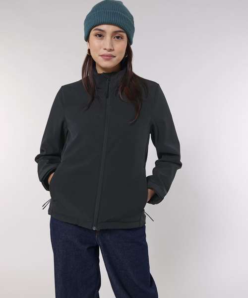 Women’s softshell jacket, medium fit with a high collar and set-in sleeve. Bottom hem with adjustable plastic stopper and elastic cord. Reverse nylon zip at centre front. Zipped outside welt pockets with reflective elastic puller. Fully bonded inside fleece layer. Side panels and stretch for better shape. Adjustable hook and loop sleeve opening. Inside seams finished with recycled binding. Water-repellent up to 10,000mm, breathability up to 3000G/M2/24hrs allowing perspiration to escape. Windproof. Bionic ECO DWR (durable, water-repellent) finish.