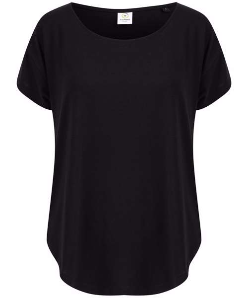 Women's scoop neck T with oversized fit and scoop neck. Dropped shoulder seams and dropped tail hem on back. Super soft fabric. Tear-out label.