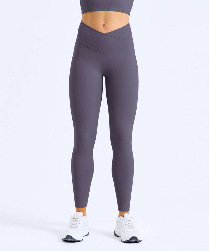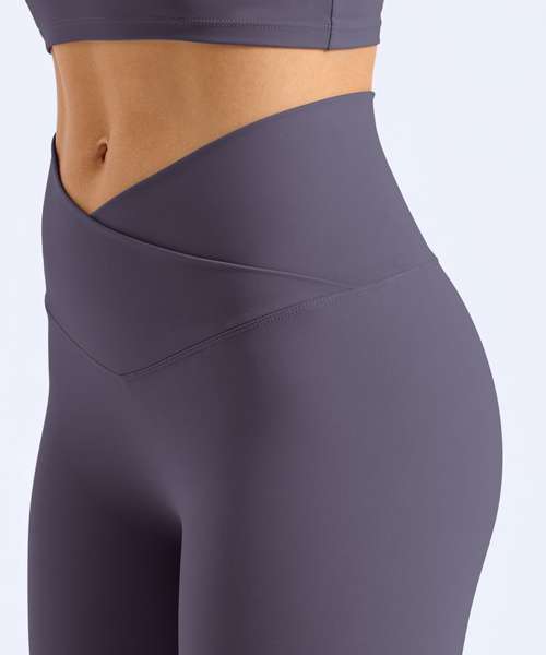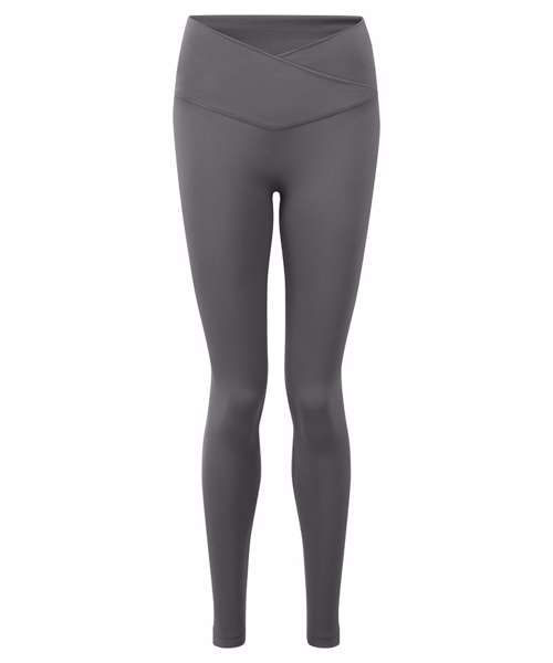 Certified recycled nylon. Stretch. Smooth finish. Cross front waistband. Full-length. Minimal seams.