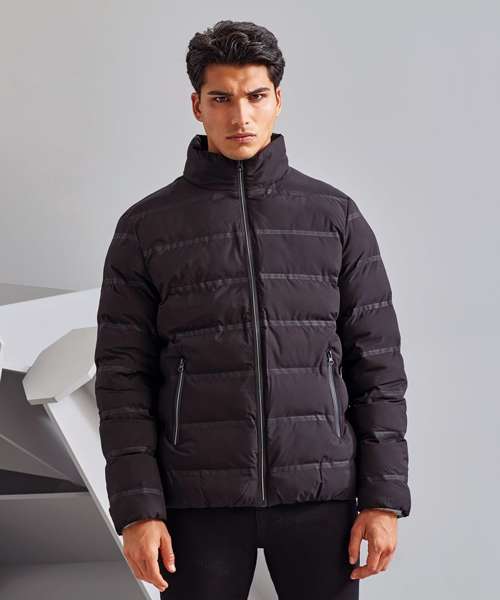 Tonal reverse coil rubberised zip tape and metallic silver teeth on centre front and pockets with signature zip puller. Welded wide baffles. 390gsm polyester fill. Fully-lined in tonal polyester. Streamlined, clean hem and cuffs with internal elastic. Internal zipped opening on back panel for embroidery access. Product contains no branded neck label.* Removable Kimble or looped garment tags. Inner seam label holds important product information on one label with a second label containing brand information which can be cut-away.